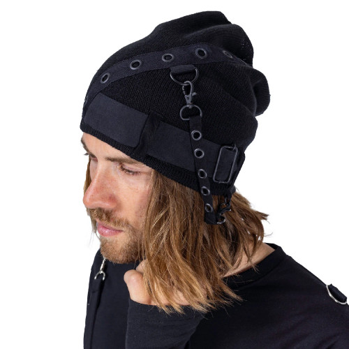 All black everything! Black slouch knit beanie, with a black sewn on strap with eyelets, and a detachable black hanging strap with eyelets attached to a black d-ring by a black carabiner.