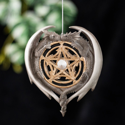 This beautiful Dragon Magic hanging ornament features a pentagram centre encircled by two dragons, making it a unique decorative accent.