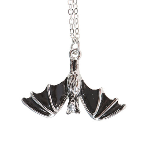 The intricately designed bat dangles from a stainless steel chained necklace.
