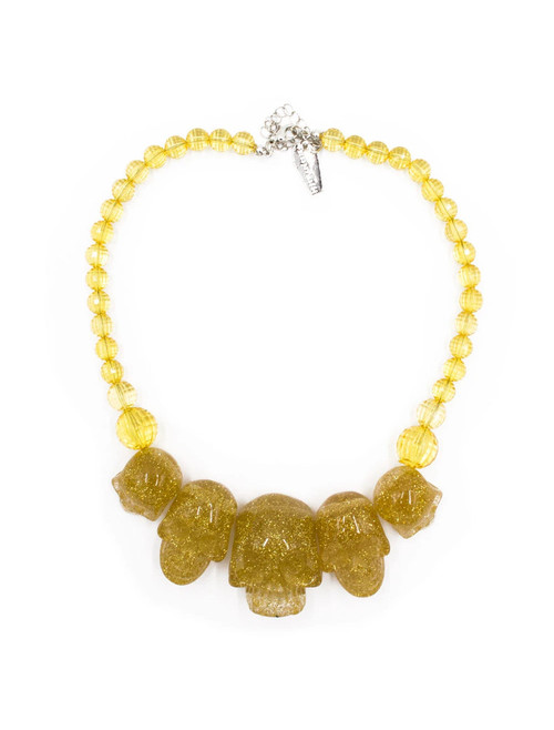 Kreepsville 666's classic Skull Collection necklace is back in glittery style! Made from a semi-transparent resin, the skull beads are mixed with gold glitter throughout for a ghoulishly fabulous result. The necklace also has an extender chain for the perfect fit and a dangling Kreepsvile coffin charm.