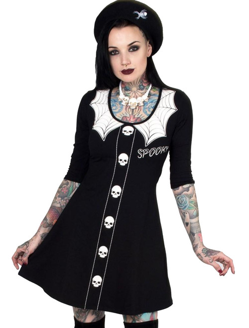 This super cute flared dress from Kreepsville features 3/4 length sleeves and a scoop neck, with a printed Peter Pan-style cobweb collar and printed skull buttons down the front to show that you're part of the family!