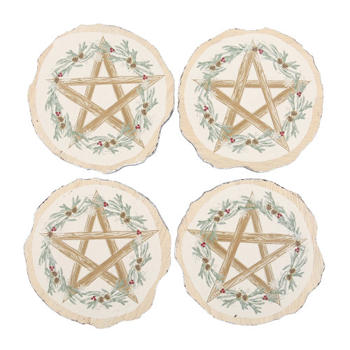 A set of 4 wood slice effect coasters featuring a pretty Winter Solstice wreath and pentagram design. These unique coasters can be used to decorate the home for Yule or Winter Solstice, the ancient pagan holiday known for traditions and rituals that celebrate nature, rebirth, transformation and the oncoming season.