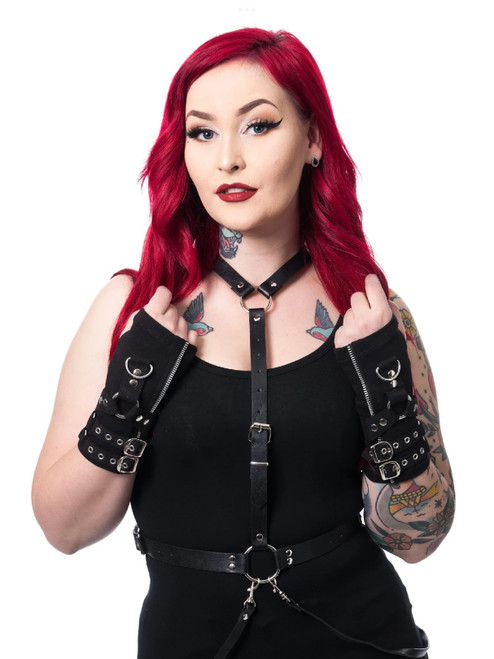 Black gloves with silver hardware, including zippers, o-rings and buckles around the wrists.