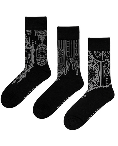 This specially curated collection features three pairs of enchanting Gothic socks: Cathedralis, Sacrum, and Inverted Cathedral, all crafted in timeless black and adorned with captivating cathedral patterns designed by Restyle. Each pair of socks was inspired by the grandeur and mysticism of Gothic architecture. Intricate motifs reminiscent of stained glass windows, vaults, spiers, and ornate stone carvings elegantly grace the fabric, lending an air of sophistication and finesse to every step taken. The patterns have been knitted using the noble jacquard technique.