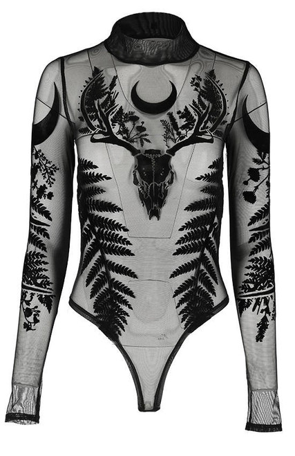 Black mesh gothic bodysuit with fern leaf print and deer horns.