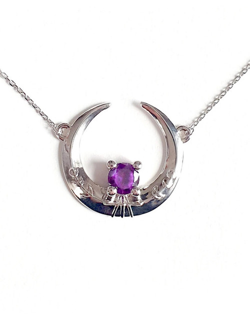 A stunning Sterling Silver Moon Necklace with the Sun and Moon hiding from each other, adorned with an Amethyst Cubic Zirconia. Mirror Polished Silver and extra magical!