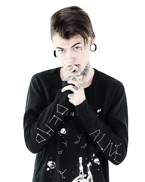 A loose-fit, long-sleeve tee with round neckline. Dark as the void fabric with cool AF graphic print on the front, and DEAD/ALIVE written in the stars on each sleeve.