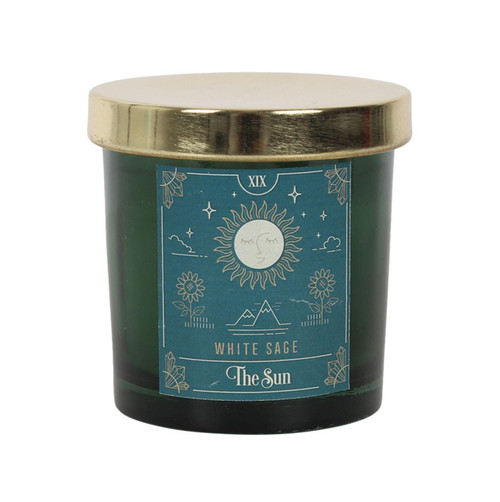 Inspired by traditional tarot card designs, this lidded candle features a stunning sun tarot design and comes in a lovely white sage fragrance.